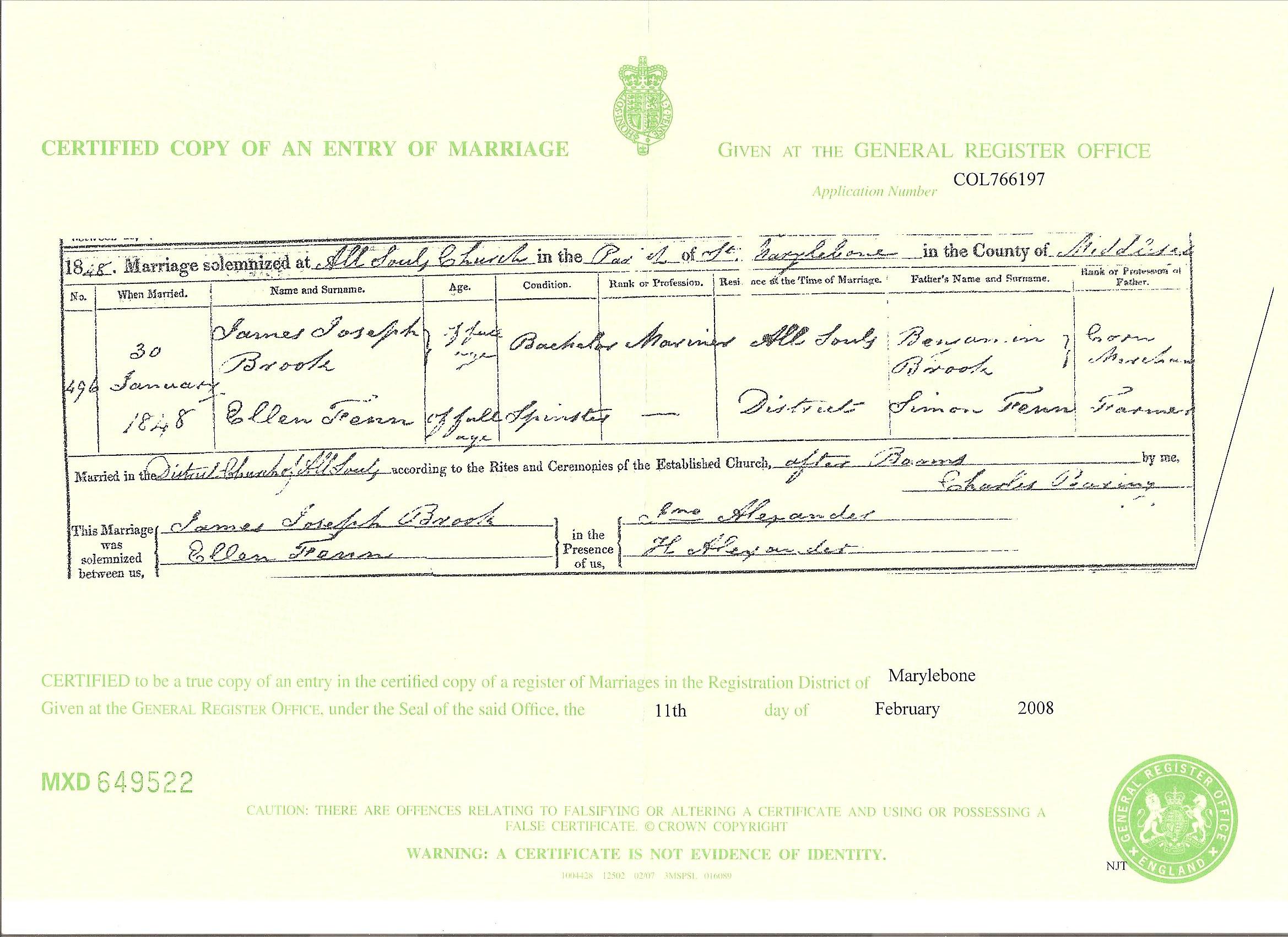 1. Census: England, 30 Mar 1851, 31 Lisson Grove St Marylebone. Ellen is recorded as a wife aged 26 born Henley SFK 2. Census: England, 2 Apr 1871, 32 Marlborough St Chelsea LND. Ellen is recorded as a wife aged 44 born Claydon SFK Ellen married James Joseph BROOK [12110] [MRIN: 4062], son of Benjamin BROOK [12117] and Anna Maria [14349], on 30 Jan 1848 in All Souls Marylebone London MDX. (James Joseph BROOK [12110] was born on 15 Jan 1827 in Marylebone London MDX, baptised on 15 Apr 1827 in St Mary le Bone LND, died on 11 Jan 1881 in Battersea London SRY and was buried on 17 Jan 1881 in Battersea London SRY.) |