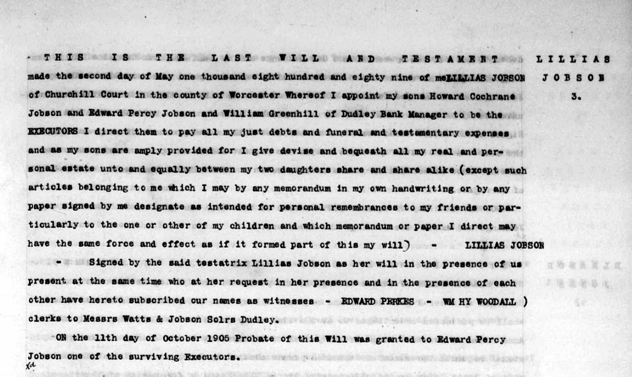 5. Lilias Edith: Will, 2 May 1889 Proved 11 Oct 1905. 6. Census: England, 5 Apr 1891, Holbeach Hse. Kingswinford STS. Lillian is recorded as the mother a widow aged 75 living on her own means born Dudley WOR 7. Census: England, 31 Mar 1901, The Lodge Hagley WOR. Lillian is recorded as head of house a widow aged 85 living on her own means born Dudley WOR Lillias married Robert JOBSON [4910] [MRIN: 1687] on 28 Jul 1841 in Wombourn Stafford. (Robert JOBSON [4910] was born about 1817 in Sheffield YKS and died on 11 Aug 1872 in Sedgley STS.) |