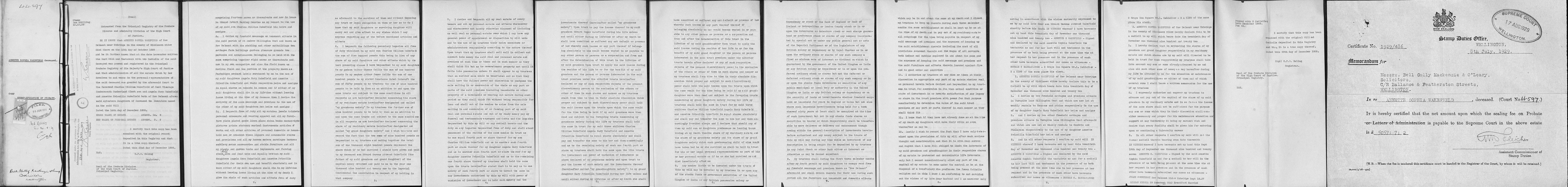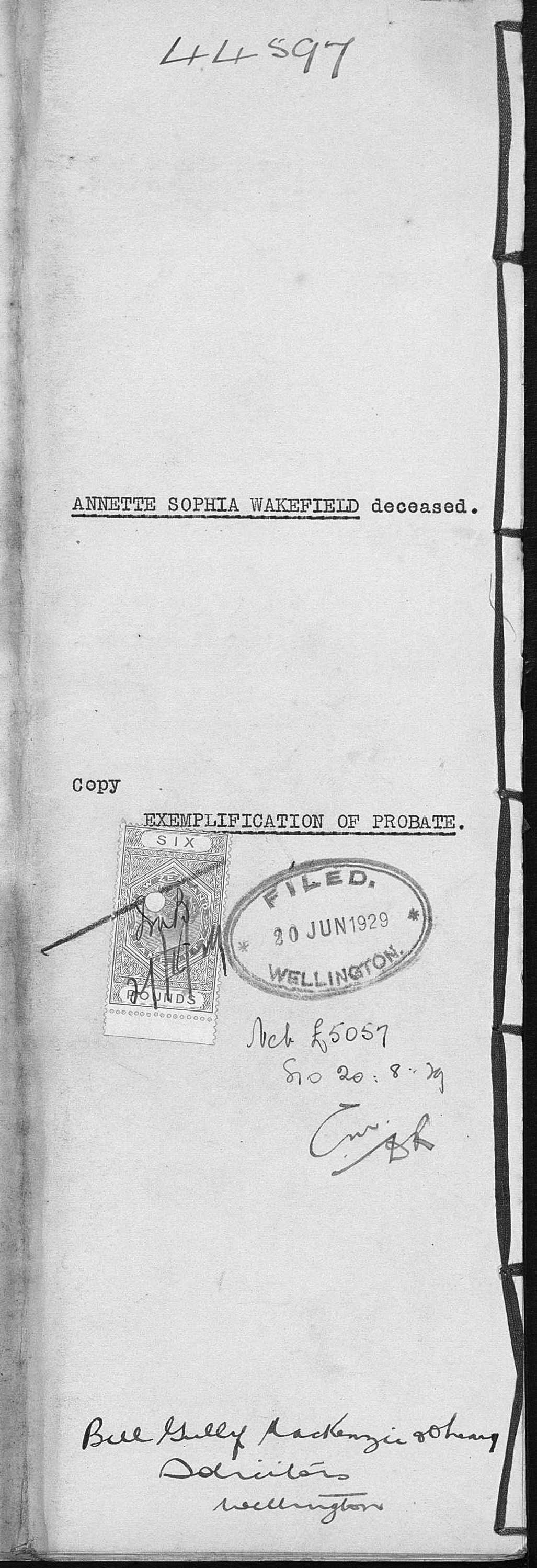 Stamp Duties Office Wellington NZ 8 Jul 1929 £5057 7 2 Probate due Stamped Supreme Court Wellington 17 Aug 1929