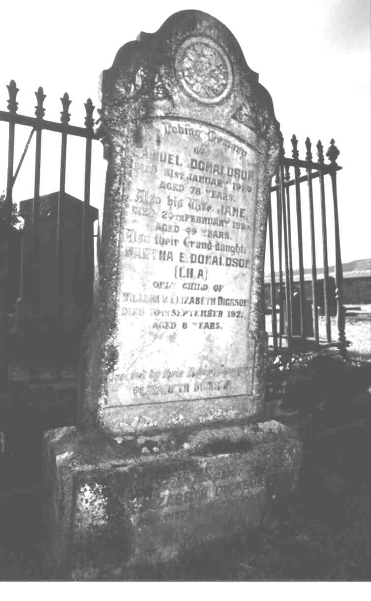 IN LOVING MEMORY OF SAMUEL DONALDSON DIED 31.1.1920. AGED 78 YEARS ALSO HIS WIFE JANE WHO DIED 20/2/1893 AGED 49 YEARS ALSO THEIR GRANDDAUGHTER MARTHA E DONALDSON (LILA) DIED 10.9.1921 ONLY CHILD OF WILLIAM AND ELIZABETH DICKSON AGED 8 YEARS