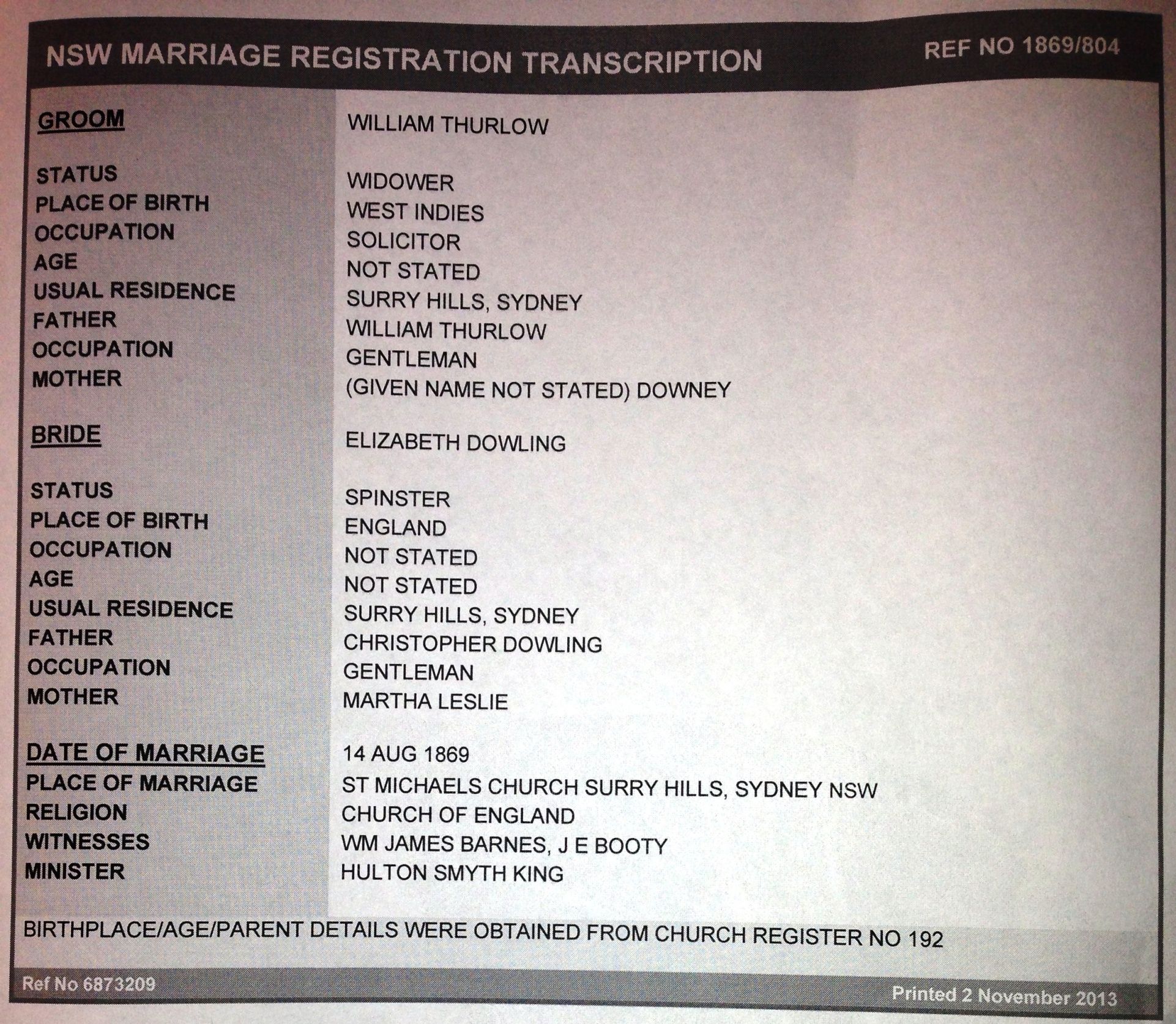 Elizabeth married William Edward THURLOW [17831] [MRIN: 7295], son of William THURLOW [17830] and Maria DONOVAN [17835], on 14 Aug 1869 in St Michaels Surrey Hills Sydney. (William Edward THURLOW [17831] was born in 1815 in West Indies and died on 15 Jan 1873 in Cundletown Manning River, NSW.) |