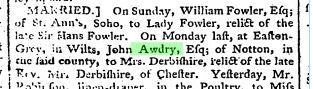 DERBYSHIRE married Sarah Susannah ROSTON [20083] [MRIN: 7316], daughter of Thomas ROSTON of Barton Court Stafford [20082] and Susanna LONG [11978]. (Sarah Susannah ROSTON [20083] was born in 1738, baptised on 3 Dec 1738 in Barton Under Needwood STS, died on 1 Jan 1816 and was buried in Seend WIL.) |