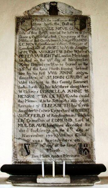 The Monument in Great Witchingham. Under the earth near this stone lyeth the dust of Oliver le Neve Esq late of this parish one of the Justices of the Peace and Captain of a Foot Company of the Militia of this County Second son of Frances le Neve gentleman Citizen and Draper of London and of Avice his wife daughter of Peter Wright and sister and heir of Peter Wright of London Merchant he died on the 23rd day of November Anno Domino 1711 and was buried on the 26th of the same month leaving behind him by his first wife Anne only ye daughter of Sir John Gaudy of West Herling in this County Baronet (who lyeth by his side) three daughters and co-heirs Isabella Anne and Henrietta le Neve who caused this Memorial to be set up As also what remains of Elizabeth his second wife daughter and co-heir expectant of Robert Sheffield of Kensington in Middlesex Esq grandson of Edmund Earl of Mulgrave long since deceased she died suddenly on the 8th day of November 1707 without child and was buried here on the 12th day of the same month Tam Math quam Mercurio.