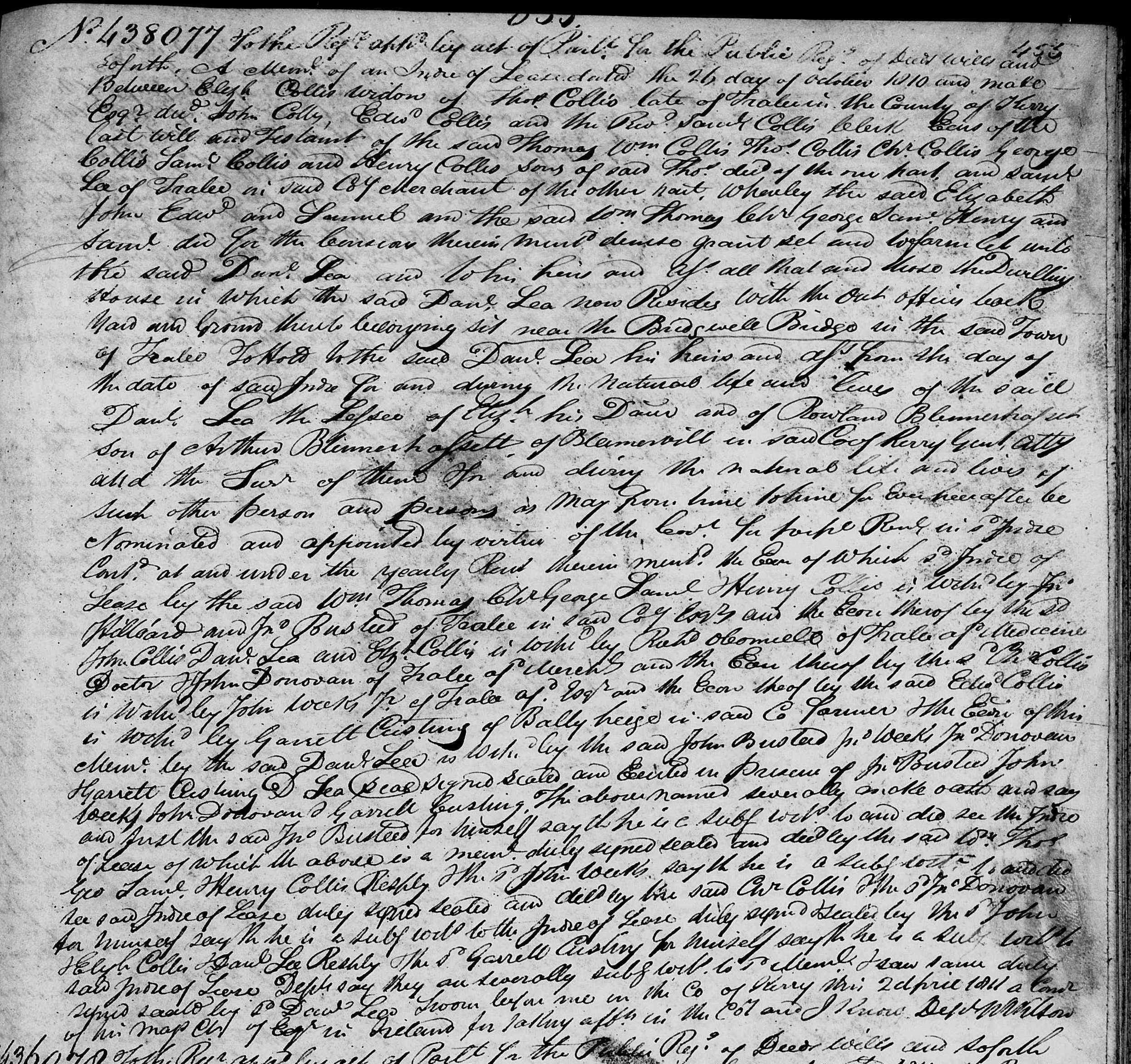 2. Elizabeth Hilliard widow of Thomas Collis: Memorandum of a Indenture of Lease, 1811, Ireland. Elizabeth spouse unknown Thomas Noble COLLIS of Barrow, Co. Kerry, [14209] [MRIN: 4752], son of COLLIS [32425] and Unknown. (Thomas Noble COLLIS of Barrow, Co. Kerry, [14209] died circa 1790 in Tralee Kerry IRL.) |