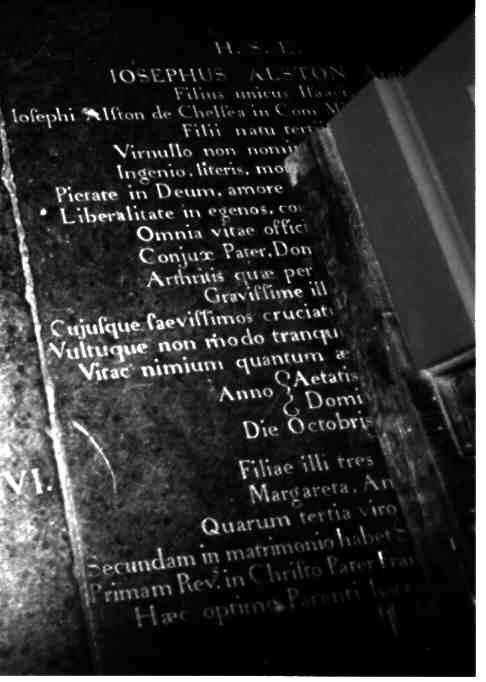 His ledger stone in Edwardstone Church was removed from the Nave to the Lady Chapel c1878 now obscured by the organ 2010, it reads: Josephus Alston Armr. filius unicus Isaaci Josephi Alston de Chelsea in Com. Middlesex, Baronetti, filii natu tertii vir nullo non nomine laudandus Ingenio, literis, moribus ornatissimus, Pietate in Deum, amore in patriam, fide in amicos liberalitate in egenos, comitate in omnes insignis omnia vite officia egregie implevit Conjux, Pater, Dominus Civis optimus. Arthritis quoe per complures annos gravissime illum afflixerat Cujusque Saevissimos cruciatus mira animi constantia vultuque non modo tranquillo sed etiam hilari pertuleraat vitoe minium quantum aerumnosae finem imposuit Anno AEtatis Sexagesimo Domini MDCCXXXVI Die- Octobris undecimo. Filiae illi tres superstites fuere Margareta Anna Charlotta quarum tertia viro nondum nupta est secundam in matrimonia habet Steph Soame de Thurlow Parva Arm, primam Revs. in Christo Pater Franc. Hare Episcopus Cicestrensis hoec optimo Parenti heres et testamenti curatrix facta. H. M. P. Ref: Alstoniana Pg. 250.