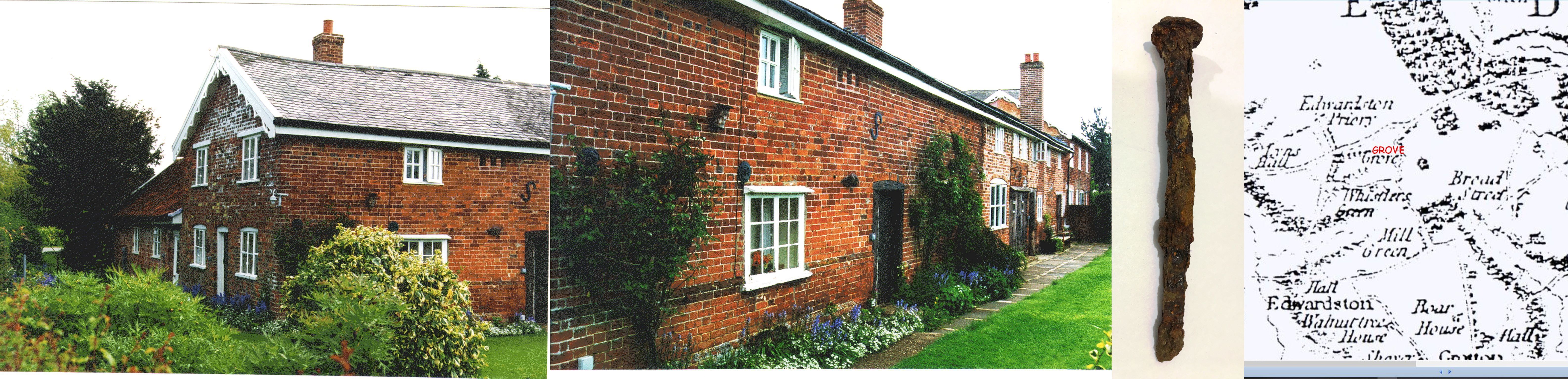 4. Joseph Alston: New House: Edwardstone SFK. Edwardstone New House/Grove. The stables and cottage converted to residences, New House mansion was demolished in the early 19th C, a wrought iron forged nail picked up on the site of New House possibly used in its construction? Map of Edwardstone showing New House/Grove to the North.