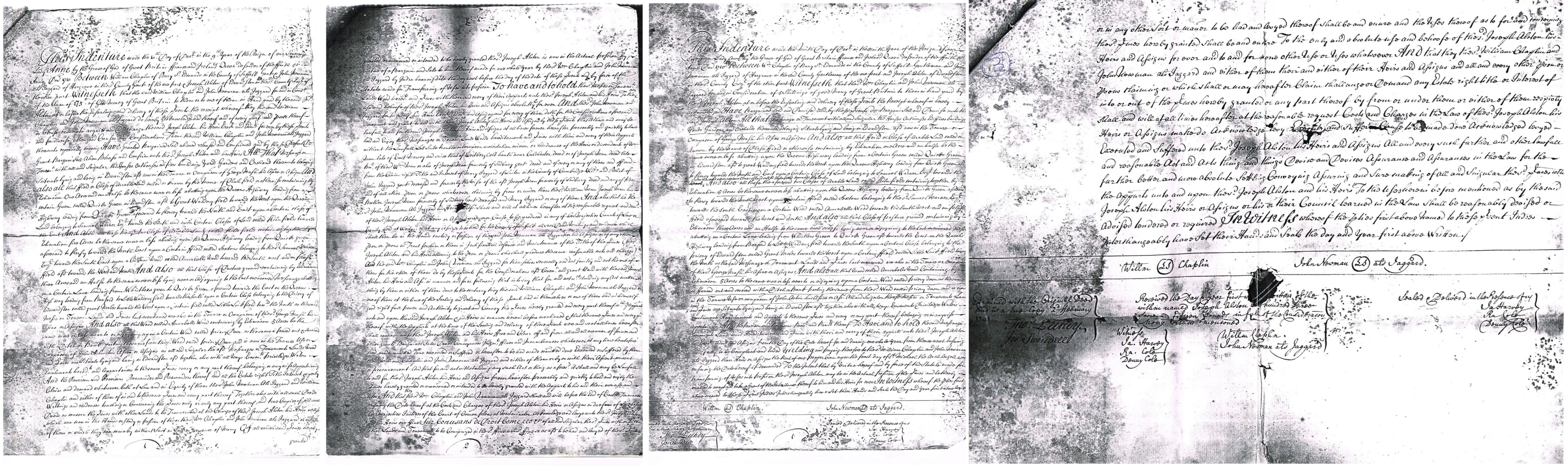 5. Joseph Alston of Edwardstone: Indenture between Chaplin, Newman & Alston, 10 Dec 1710. Precis of Indenture made 10th day of December 1710. Indenture between William Chaplin of Bury St Edmunds Gent, John Newman also Jaggard of Hargrave all in the County of Suffolk of the one part and Joseph Alston of Edwardstone Suffolk of the other part. Witnesseth that the said William Chaplin John Newman also Jaggard for a consideration of L175 paid by Joseph Alston sell and convey to Joseph Alston a messuage situated in Edwardstone and in the occupation of George Mash Also a field of arable land known by the name of Clarkfield containing one acre and a half more or less abutting the Queen's highway running from Quicks Green in Edwardstone to Great Waldingfield in the West and Kilnfield in the East Also two closes of arable land called Kilnfield's containing five acres more or less abutting the Queen's highway as above Also a close of pasture ground containing three and a half acres more or less adjoining Kilnfield's above and a lane leading from Whistler's Green to Quicks Green and on the Queen's highway leading from Boxford to Little Waldingfield to the south in the tenure of George Mash aforesaid Also a wood called Annabells Wood containing five acres more or less adjoining a wood called Priory Down fenced out with a ditch or bank from Annabells Wood and in the tenure of John Aslin all the above situated in Edwardstone. This transaction is preceded by an Indenture for Lease and Release of the above described lands dated 9 December 1710 between the above parties. These documents are contained on four A3 sheets and contain a great deal of detail on the location of the properties and terms of agreement. Ref Bury R.O. 391/9