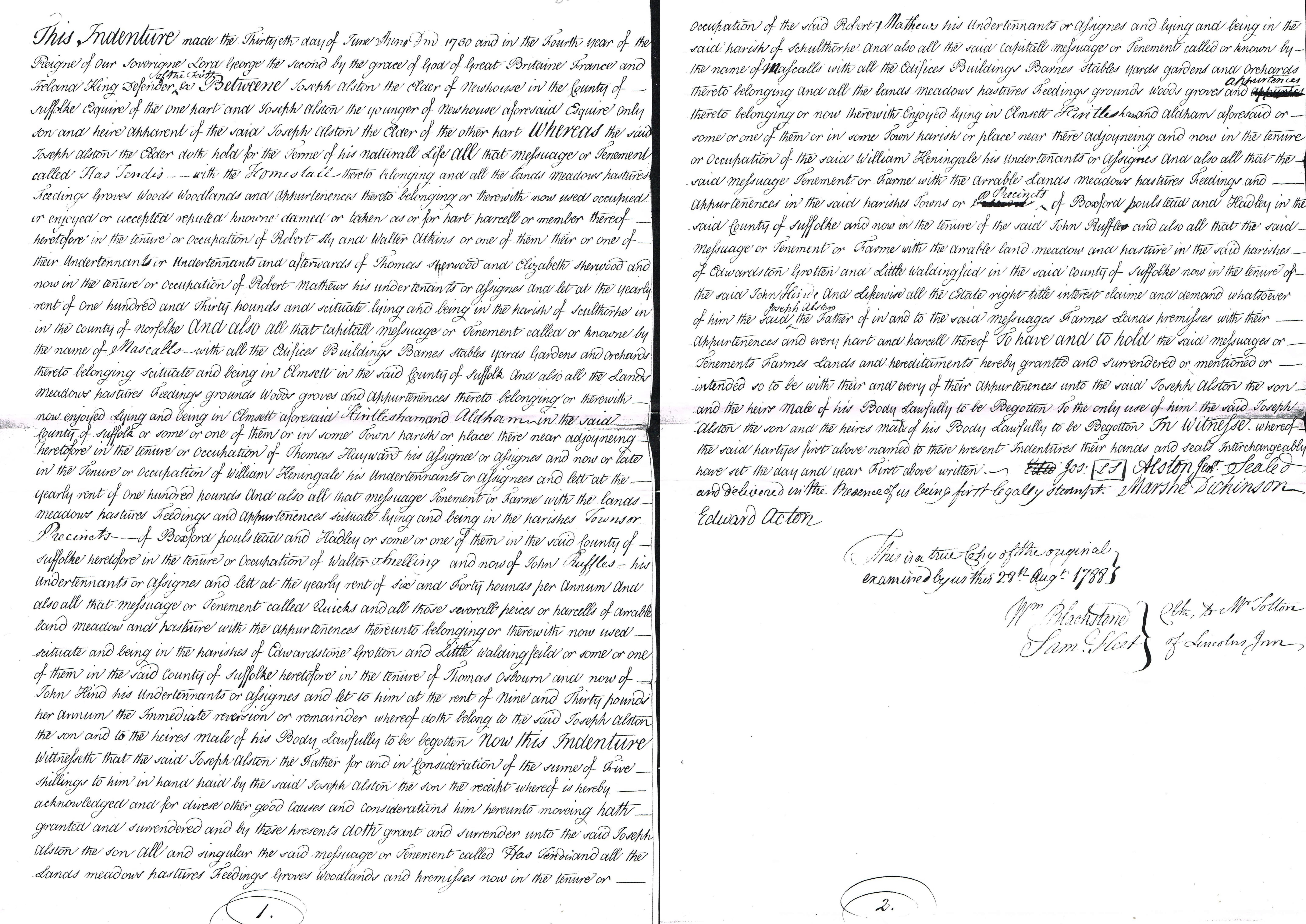 6. Joseph Alston of New House snr: Indenture Joseph Alston of New House Snr & Jnr, 30 Jun 1730. THIS INDENTURE made the thirtieth day of June Anno Domino 1730 and in the fourth year of the reign of our sovereign Lord George the second by the grace of God of Great Britain France and Ireland King Defender of the faith. BETWEEN Joseph ALSTON the Elder of Newhouse in the County of Suffolk Esquire of the one part and Joseph ALSTON the Younger of Newhouse aforesaid Esquire only son and heir apparent of the said Joseph ALSTON the Elder of the other part WHEREAS the said Joseph ALSTON the Elder doth hold for the Terme of his natural life ALL that messuage or tenement called Has Tendis (sic) with the Homestall thereto belonging and all the lands meadows pastures seedings groves woods woodlands and appurtances thereto belonging or herewith now used occupied or enjoyed or accepted reputed known deemed of taken as or for part parcel or member thereof heretofore in the tenure or occupation of Robert SLY and Walter ATKINS or one of them their or one of their undertennant or undertennants and afterwards of Thomas SHERWOOD and Elizabeth SHERWOOD and now in the tenure or occupation of Robert MATHEWS his undertennant or assigns and let at the yearly rent of one hundred and thirty pounds and situate lying and being in the Parish of Sculthorpe in the County of Norfolk AND ALSO ALL that capital messuage r tenement called or known by the name of MASCALLSs with all the edifice buildings barnes stables yards gardens and orchards thereto belonging situate and being in ELMSETT in the said County of Suffolk and also all the lands meadows pastures feedings grounds woods groves and appurtances thereto belonging or herewith now enjoyed lying and being in ELMSETT aforesaid HINTLESHAM and ALDHAM in the said County of Suffolk or some or one of them or in some town parish or place there near adjoining thereforeto in the tenure or occupation of Thomas H . . . . . and his . . . . . precincts of Boxford Polstead and Hadley (Hadleigh) or some or one of them in the said County of Suffolk therefore in the tenure of occupation of Walter SMELLING and now of John RUFFLES his undertennanrts of assigns and let at the yearly rent of six and forty pounds per annum and also all that messuage or tenement called Quicks and all those severall pieces or parcels of arable land meadow and pasture with the appurtances thereunto belonging or herewith now used situate and being in the parishes of Edwardstone Groton and Little Waldingfield or some or one of them in the said County of Suffolk heretofore in the tenure of Thomas OSBOURN and now of John HIND his undertennants or assigns and let to him at the ret of nine and thirty pounds per annum the immediate reversion or remainder whereof doth belong to the said Joseph ALSTON the son and to the heirs male of his body lawfully to be begotton NOW THIS INDENTURE witnesseth that the said Joseph ALSTON the father for and in consideration of the sums of five shillings to him in hand paid by the said Joseph ALSTON the son the receipt whereof is herby acknowledged and for diverse other good causes and considerations him hereunto moveing hath granted and surrendered and by these presents doth grant and surrender unto the said Joseph ALSTON the son all and singular the said messuage or tenement called Has Tendis and all the lands meadows pastures feedings groves woodlands and premises now in the tenure or occupation of the said Robert MATHEWS his undertennants or assigns and lying and being in the said parish of Sculthorpe and also all the said capital messuage or tenement called or know by the name of MASCALLS with all the edifices buildings barnes stables yards gardens and orchards thereto belonging or now therewith enjoyed being in ELMSETT HINTLESHAM and ALSDHAM aforesaid or some or one of them or in some town parish or place near there adjoining and now in the tenure pr occupation of the said William HENINGALE his undertenants or assigns and also all that the said messuage tenement or farm with the arable lands meadows pasture feedings and appurtances in the said parishes towns or precincts of Boxford Polstead and Hadley in the said County of Suffolk and now in the tenure of the said John RUFFLES and also all that the said messuage or tenement or farm with the arable land meadows and pasture in the said parishes of Edwardstone Groton and Little Waldingfield in the said County of Suffolk now in the tenure of the said John HINDE and likewise all the estate right title interest claim and demand whatsoever of him the said Joseph ALSTON the father of in and to the said messuage farms lands premises with their appurtances and every part and parcel thereof TO HAVE AND TO HOLD the said messuage or tenements farms lands and hereditaments herby granted and surrendered or mentioned or intended so to be with their and every of their appurtances unto the said Joseph ALSTON the son and the heirs of his body lawfully to be begotton IN WITNESS whereof the said parties first above named to these present indentures their hands and seals interchangeably have set the day and year first above written. Jos. ALSTON, gent SEALED and delivered in the presence of us being first legally stamped. Marshe DICKINSON Edward ACTON This is a true copy of the original examined by us this 28th August 1788 Wm. Blackstone, Sam. G. Fleet - Clerk to Mr. Totton of Lincolns Inn. Bury RO 391/9 From Susan Perrett 2004