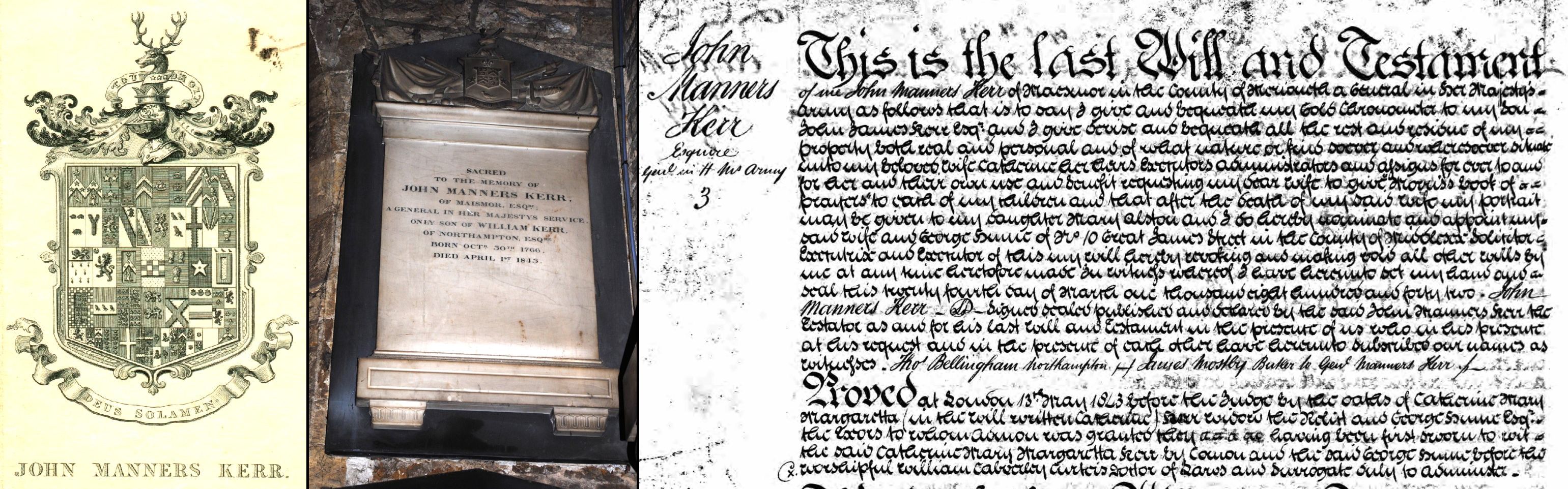 1. John Manners Kerr: Arms, Monument and Will. Will of John Manners Kerr Esq. 4 March 1842. This is the last Will and Testament of me John Manners Kerr of Maesmor Merioueth [?] a General in her Majesty's army as follows that is to say I give and bequeath my gold chronometer to my son John James Kerr Esq and I give devise and bequeath all the rest and residue of my property both real and personal and of what nature or kind so ever and whatsoever unto my beloved wife Catherine her heirs executors administrators and assigns for ever to and for her and their own use and benefit requesting my dear wife to give . . . . . book of prayers to each of my children and that after the death of my said wife my portrait may be given to my daughter Mary Alston and I do so hereby nominate and appoint my said wife and George Hunt of No 10 Great James Street in the County of Middlesex solicitor executrix and executor or of this my Will here by revoking and making void all other wills by me at any time heretofore made in witness whereof I have hereunto set my hand and seal this 24th day of March 1842. John Manners Kerr signed sealed published and delivered by the said John manners Kerr the testator as and for his last Will and Testament in the presence of us who in his presence at his request and in the presence of each other have hereunto subscribed our names as witnesses. Thomas Bellingham Northampton James Mostby butler to General Manners Kerr