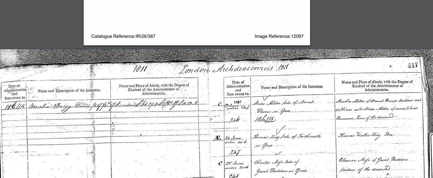 1. Moses Alston: Administration Index, 1811, London. Moses married Amelia [5286] [MRIN: 1577]. Moses next married Martha BRAND of Mt Bures [5269] [MRIN: 1570] on 20 Apr 1775 in Mt Bures Chapel ESS. (Martha BRAND of Mt Bures [5269] was born about 1736 and was buried on 23 Feb 1814 in St Barnabus Chapel Mt Bures ESS.) |