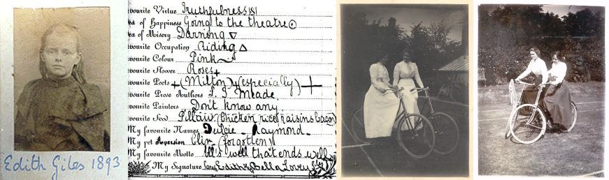 1. Edith Giles: Her Confession to Dolly Cotes [486] & other images, Cir 1895. Edith 1893, Edith completed a Confessions in Dolly Cotes book, at Selwyn Gardens c1900 with Edith on left, Mabel on right.