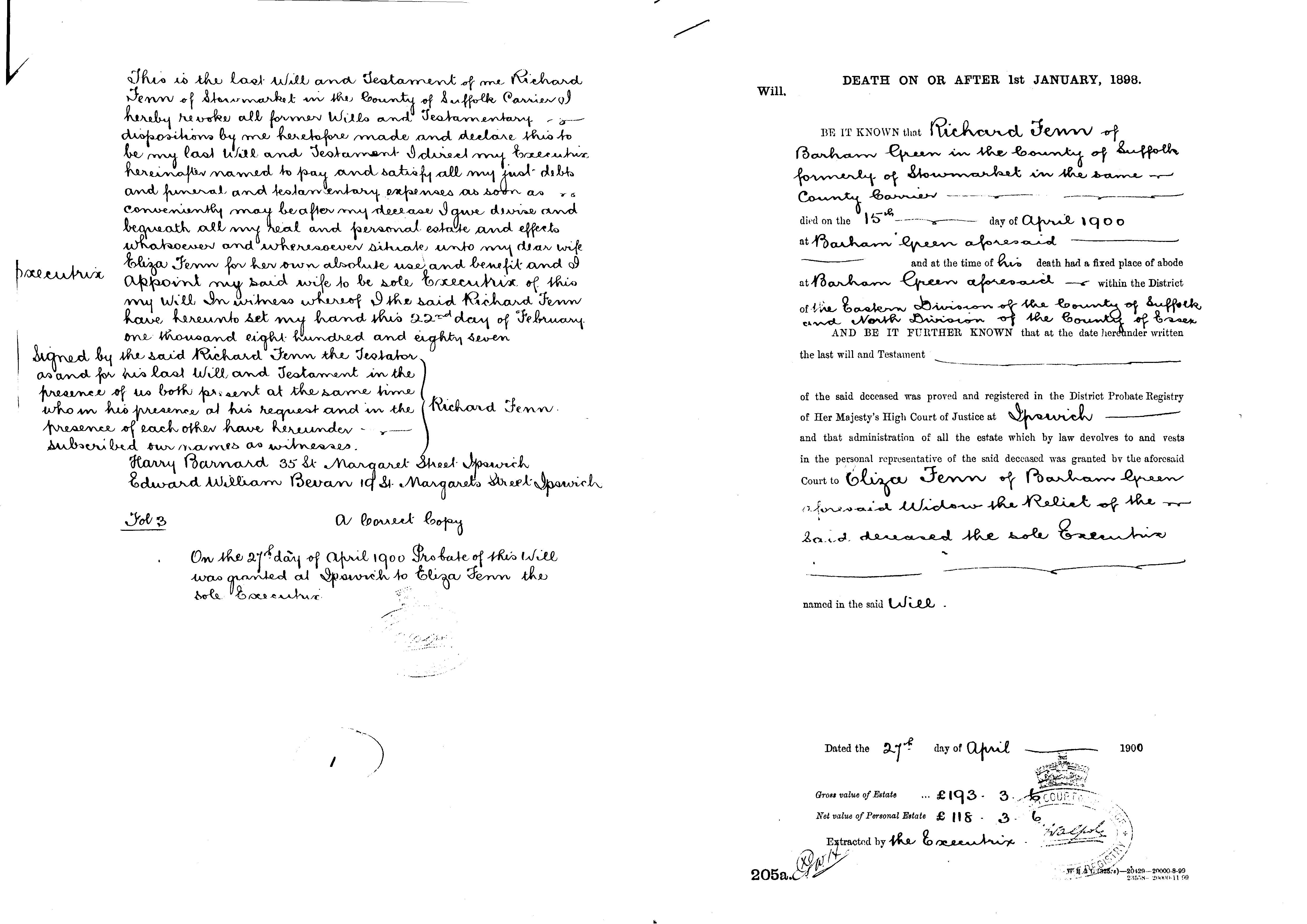 1. Census: England, 7 Jun 1841, Hemingstone SFK. Richard is described as aged 13 born SFK 2. Census: England, 30 Mar 1851, Barham SFK. Richard is recorded as brother-in-law to George Potter aged 23 unmarried farm servant born Hemingstone 3. Census: England, 2 Apr 1871, Barham SFK. Richard is recorded as head of house married aged 43 farmer of 45 acres employing 3 men 1 boy born Hemingstone 4. Census: England, 3 Apr 1881, Brook Farm Hemmingstone SFK. Richard is described as head of house married aged 53 farmer of 120 acres employing 4 men born Hemingstone SFK 5. Census: England, 5 Apr 1891, Barham SFK. Richard is recorded as head of house married aged 63 a labourer born NK Suffolk. Richard married Eliza BALDWIN [4610] [MRIN: 270], daughter of Robert BALDWIN [9650] and Eliza CHINNERY [20412], on 26 Oct 1853 in Barham SFK. (Eliza BALDWIN [4610] was born on 30 Aug 1835 in Barham SFK and died on 20 Jul 1913 in Barham SFK.) |
