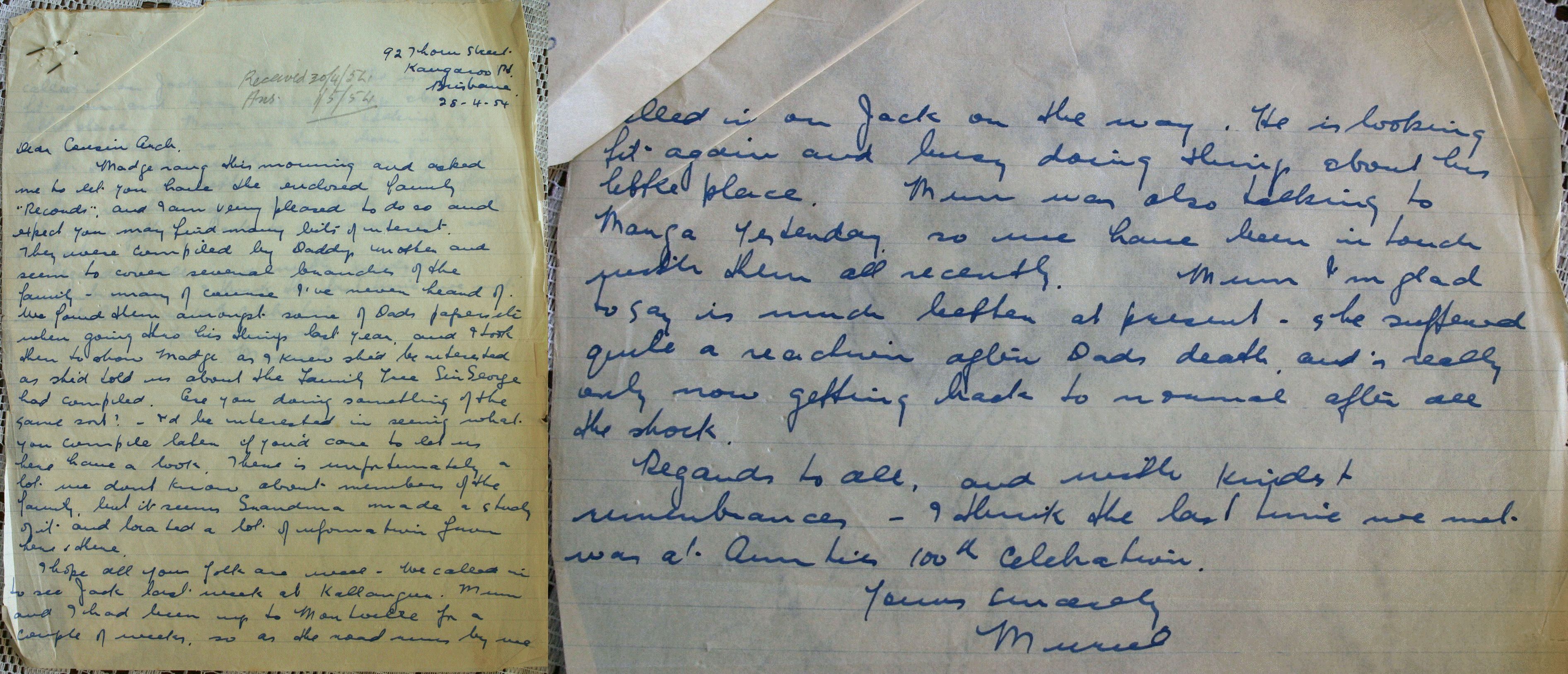 1. Muriel G Julius: Letter by Muriel to Archibald Julius enclosing family records, 28 Apr 1954, Brisbane AU. 92 Thorn St Kangaroo Point Brisbane. 28-4-54. Dear Cousin Arch, Madge rang this morning and asked me to let you have the enclosed family "Records" and I am very pleased to do so and expect you may find many bits of interest. They were compiled by Daddy's mother and seem to cover several branches of the family - many of course I've never heard of. We've found them amongst some of Dad's papers etc when going thro his things last year, and I took them to show Madge as I know she'd be interested as she'd told us about the Family Tree Sir George had compiled. Are you doing something of the same sort? I'd be interested in seeing what you compile later if you would care to let us have a look. There is unfortunately a lot we don't know about members of the family, but it seems Grandma made a study of it and Laura had a lot of information from here and there. I hope all your folk are well - we called in to see Jack last week at Kallangua. Mum and I had been up to . . . . . for a couple of weeks so as a road runs by we called in on Jack on the way. He is looking fit again and busy doing things about this little place. Mum was also talking to Manga yesterday so we have been an touch with them all recently. Mum I'm glad to say is much better at present - she's suffered quite a reaction after dad's death, and is really only now getting back to normal after all the shock. Regards to all, and with kindest remembrances - I think the last time we met was at Auntie's 100th celebration. Yours sincerely, Muriel.