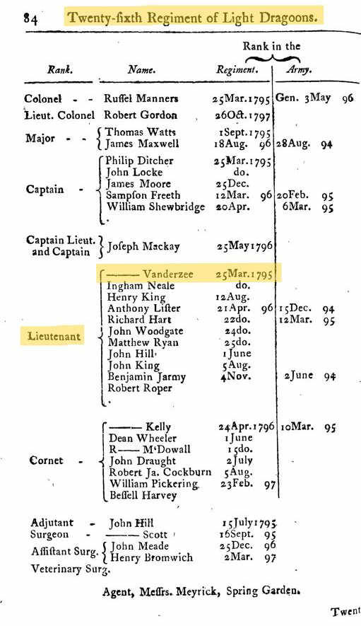 Fourth Regiment William Newcombe to be Ensign vice Vanderzee deceased Ref: War Office Caledonian Mercury Monday 26 October 1807 This may not be David Vanderzee?